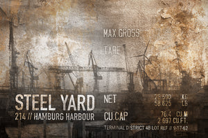 STEEL YARD zeigt den Hamburger Hafen nicht als Kulisse, sondern als Arbeitsraum. Stahl, Struktur und Patina verdichten sich zu einer Bildfläche, die von Nutzung, Zeit und Schwere erzählt. Kräne, industrielle Formen und typografische Fragmente verweisen auf Funktion und Wiederholung – auf einen Ort, der nicht repräsentiert, sondern gebraucht wird.